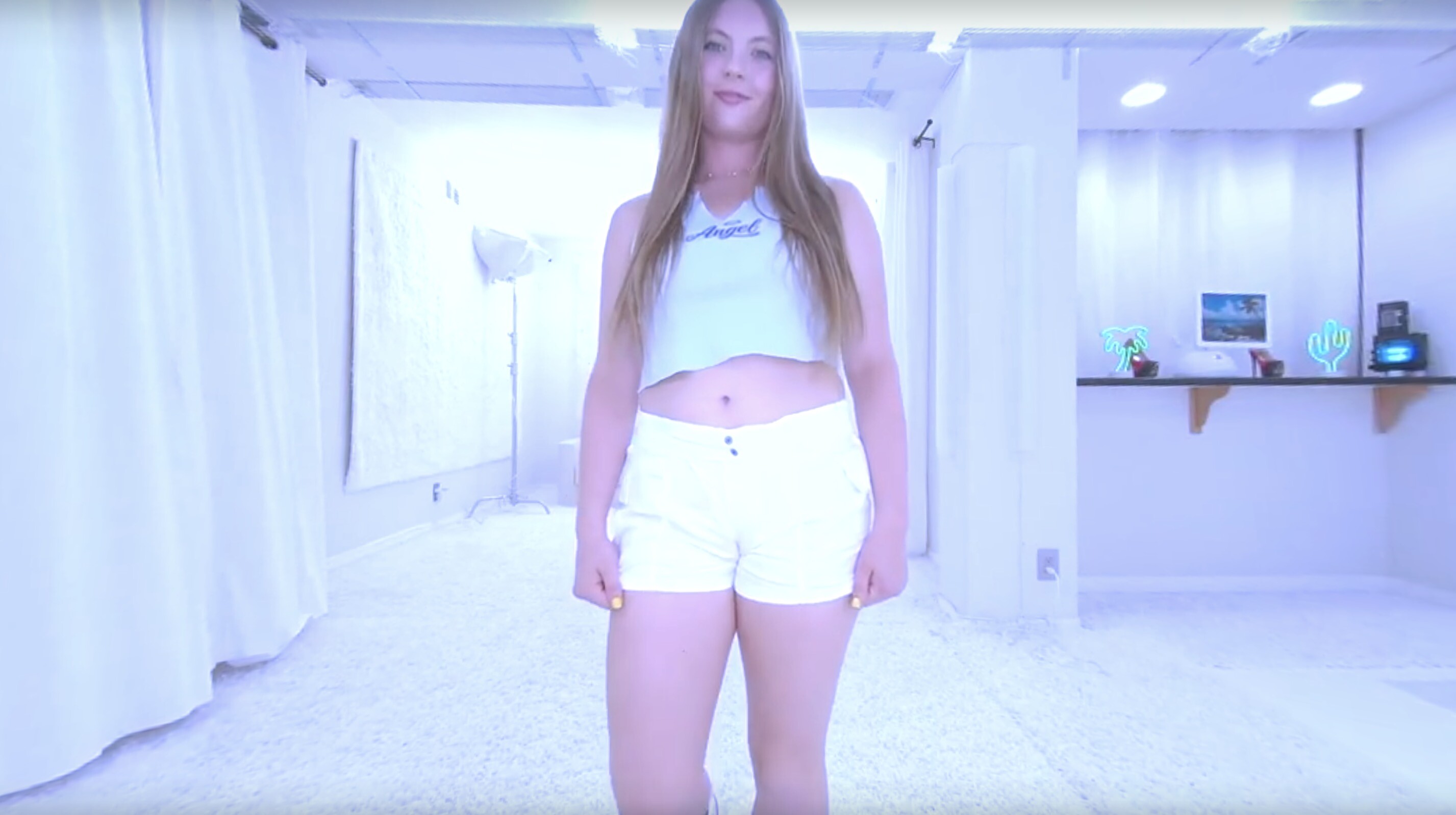 Man, I gotta tell ya, watching Zoey Zimmer in this white studio setup is something else. Right from the start, she’s got this playful, teasing vibe that just pulls you in. Her blonde hair catches the light perfectly, and those eyes? They’re locked on you, like she knows exactly what she’s doing to ya.