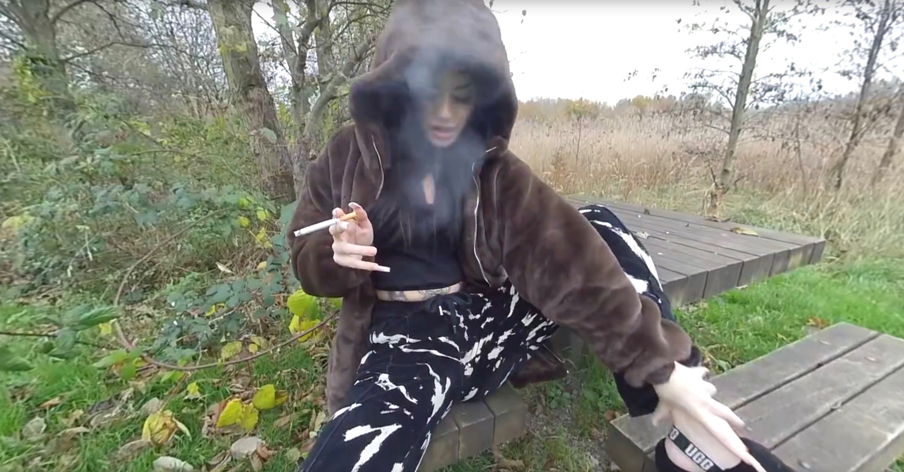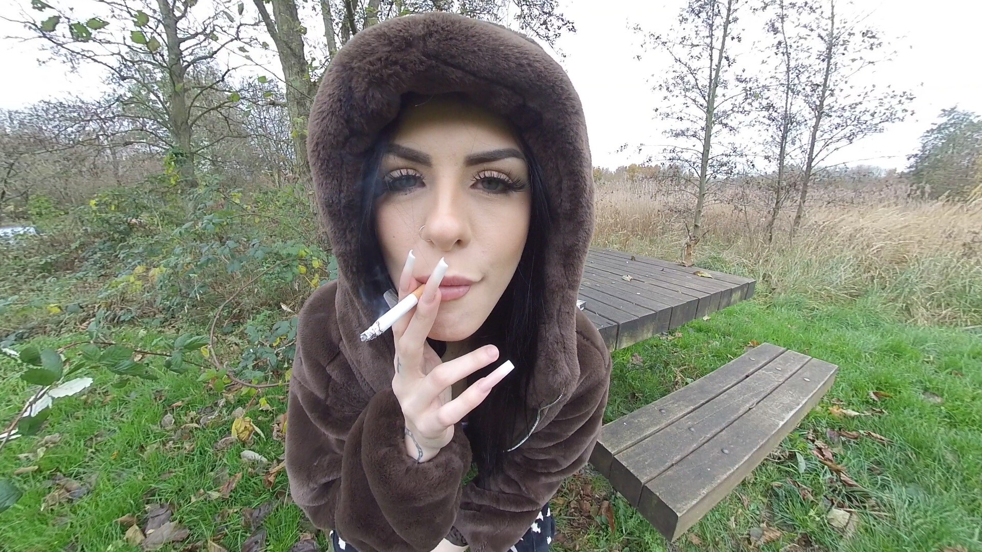 A typical drizzly day in Britain, but the weather won;t stop shay from smoking and flashing her very nice tits!