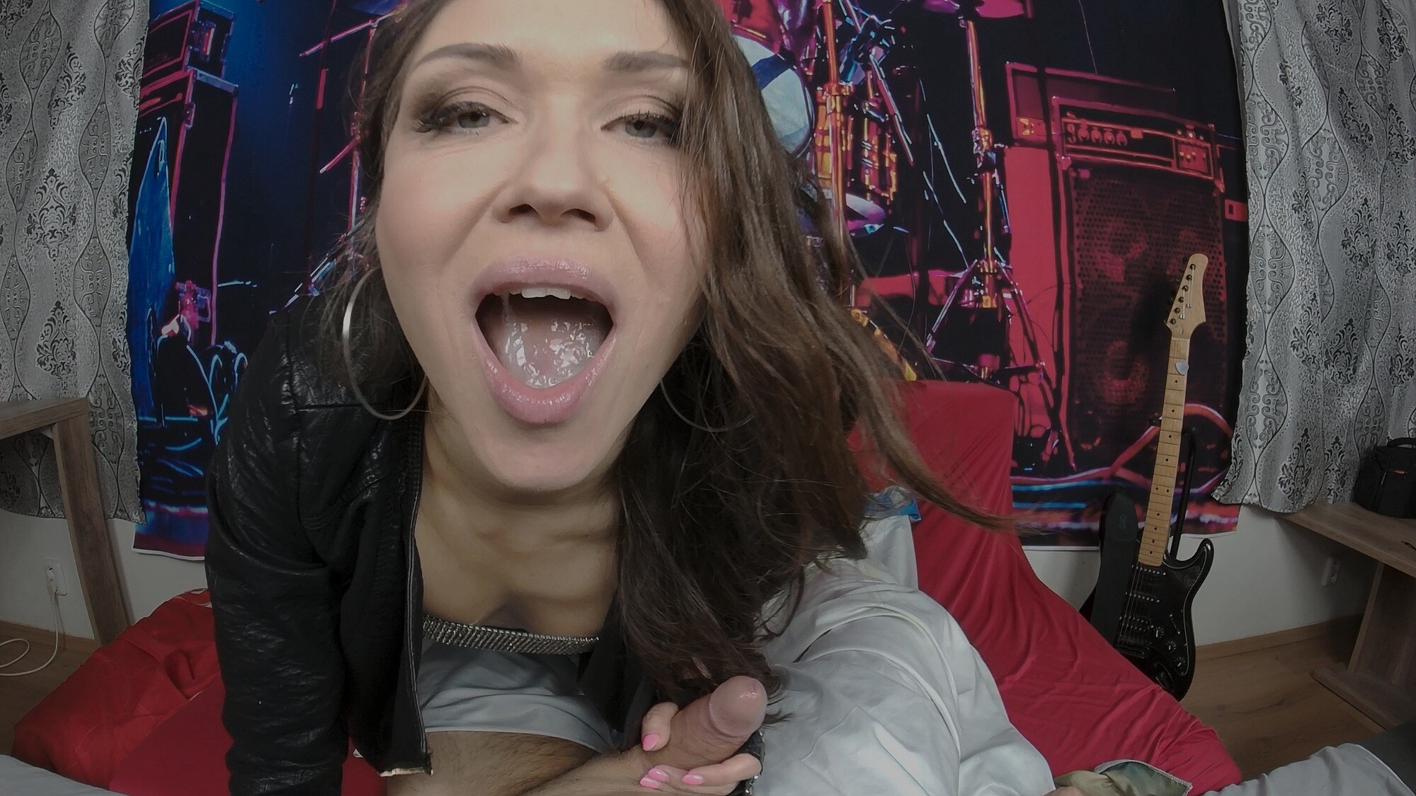 The tension builds quick when she drops the guitar and gets up close in that immersive VR POV. The way she moves into the cowgirl position—damn, it’s like she’s takin’ control of the whole show, every move dialed up to eleven. You can feel the heat risin’ as her passion kicks in, and when she flips to reverse cowgirl, it’s pure fire, man, I’m tellin’ ya.