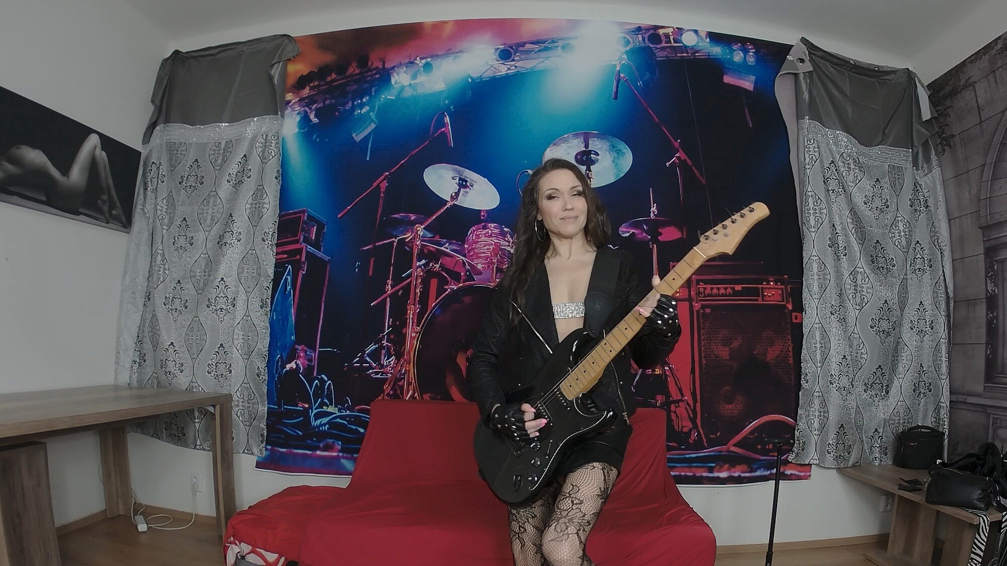 Man, I gotta tell ya, diving into this 8K VR experience with Kristina Grace in 'Rockstar Seduction' is somethin’ else. Right from the start, you’re hit with her raw energy—she’s decked out in this killer leather outfit, strumming a guitar like she owns the stage. Honestly, that seductive gaze of hers just pulls you in, and you know you’re in for a wild ride.