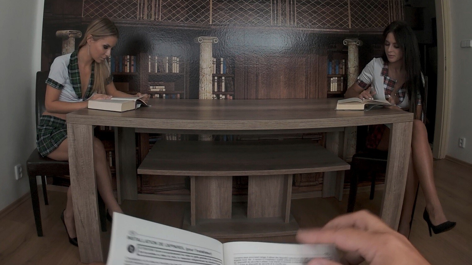 You find yourself in the university library, surrounded by books and quiet study. Mia Trejsi and Lucky Bee are studying alongside you. As you read through your notes, Mia decides it's time for a study break and drops to her knees, starting to suck your cock. The atmosphere is electric as she teases you with her tongue. Lucky Bee notices the situation unfolding and can't help but join in on the fun. The two college girls take turns blowing you, building up to a cum-swapping finale that will leave you breathless.
